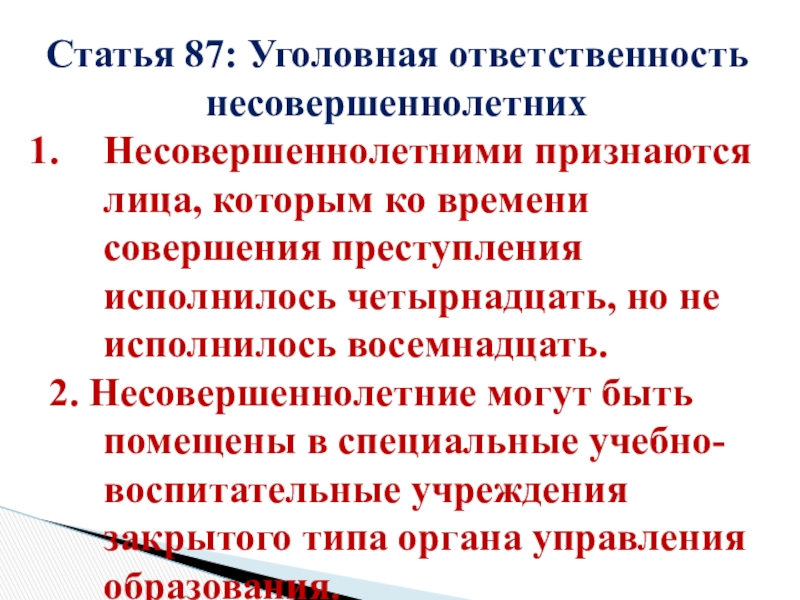 Слайд 12Статья 87: Уголовная ответственность несовершеннолетних