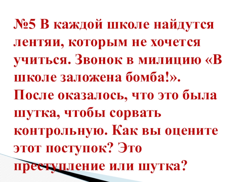 в милицию «В школе заложена бомба!». После оказалось, что это была шутка, чтобы сорвать контрольную. Как вы оцените этот поступок? Это преступление или шутка?