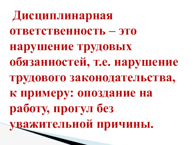 Слайд 29 Дисциплинарная ответственность – это нарушение трудовых обязанностей, т.е. нарушение трудового
