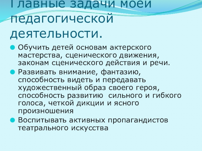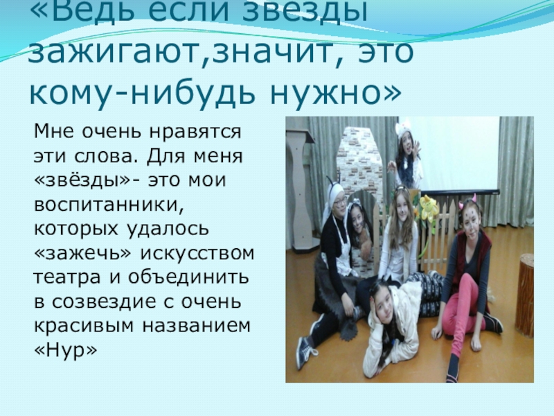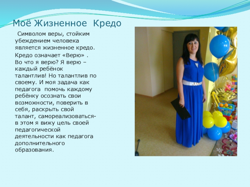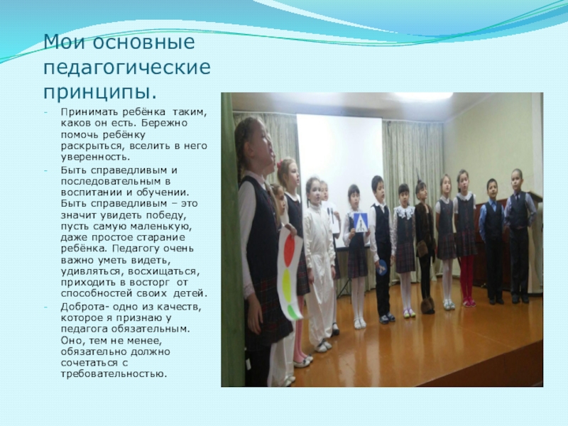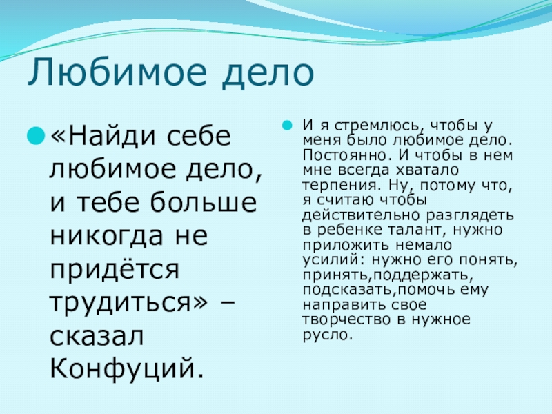 И я стремлюсь, чтобы у меня было любимое дело. Постоянно. И чтобы в нем мне всегда хватало терпения. Ну, потому что, я считаю чтобы действительно разглядеть в ребенке талант, нужно приложить немало усилий: нужно его понять, принять,поддержать,подсказать,помочь ему направить свое творчество в нужное русло.