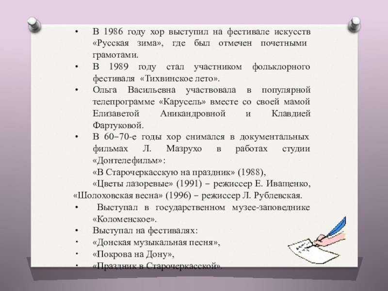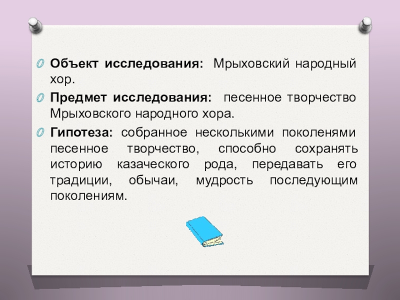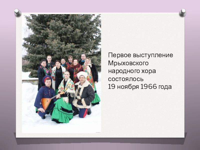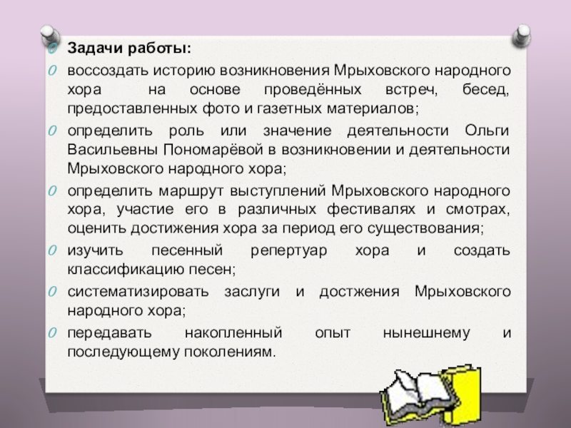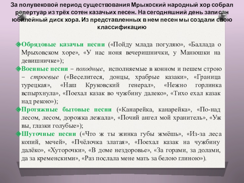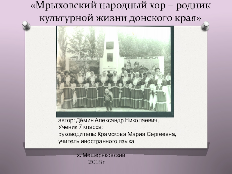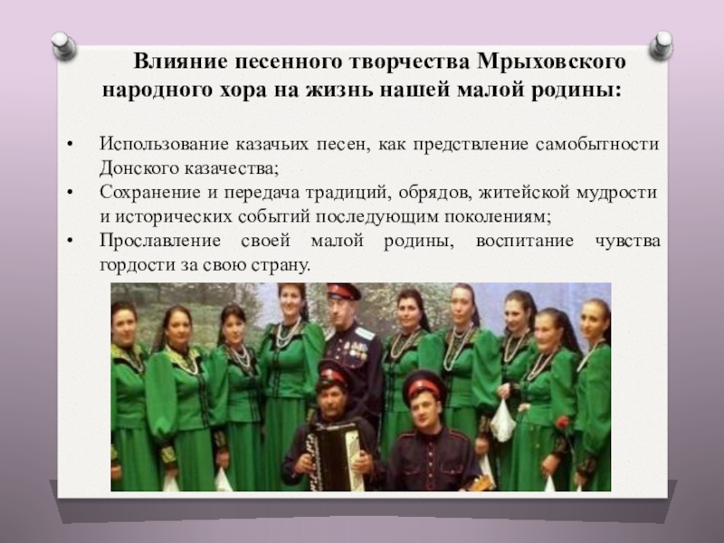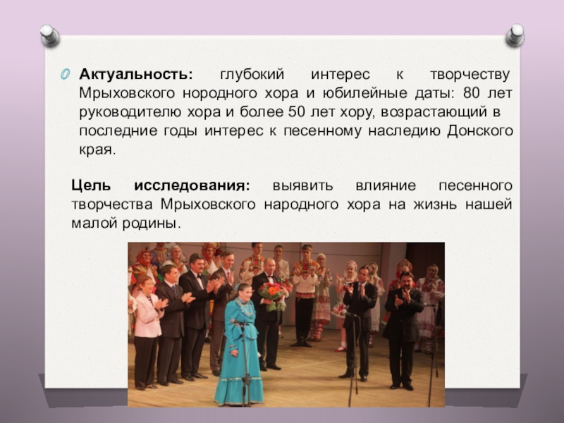 Цель исследования: выявить влияние песенного творчества Мрыховского народного хора на жизнь нашей малой родины.