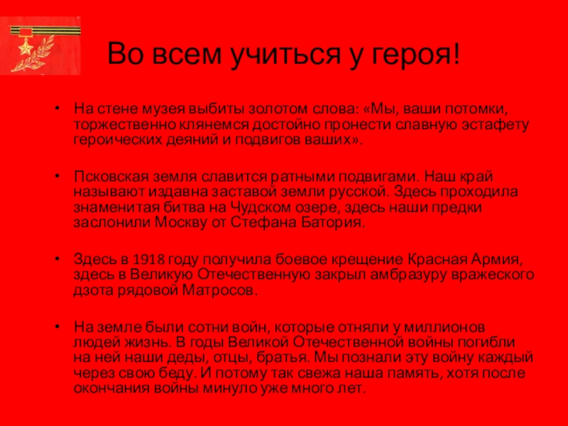 Здесь в 1918 году получила боевое крещение Красная Армия, здесь в Великую Отечественную закрыл амбразуру вражеского дзота рядовой Матросов.