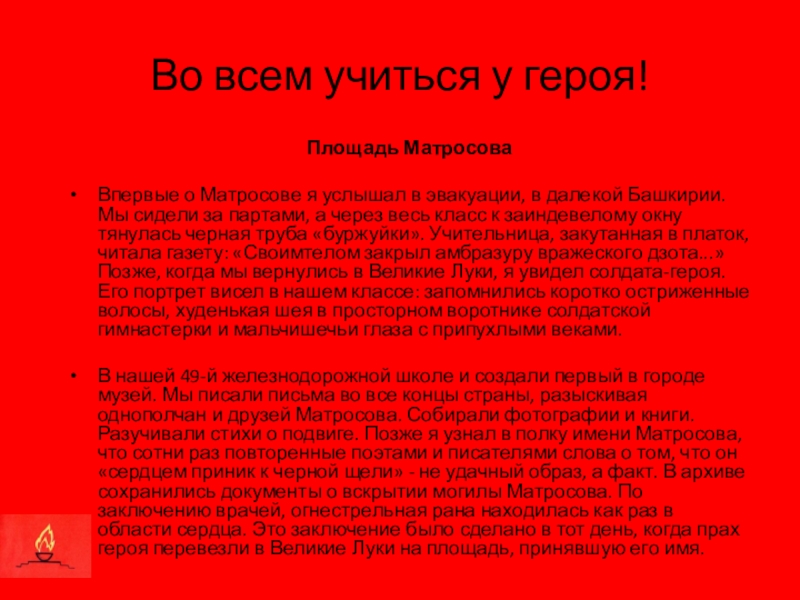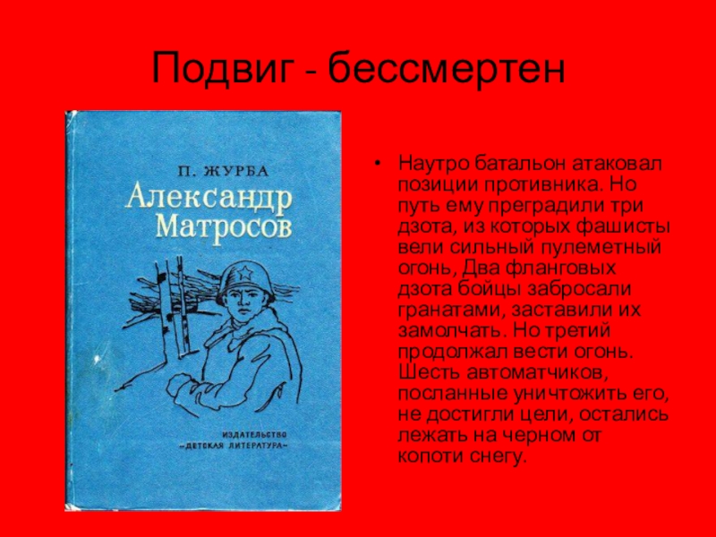 Впервые о Матросове я услышал в эвакуации, в далекой Башкирии. Мы сидели за партами, а через весь класс к заиндевелому окну тянулась черная труба «буржуйки». Учительница, закутанная в платок, читала газету: «Своимтелом закрыл амбразуру вражеского дзота...» Позже, когда мы вернулись в Великие Луки, я увидел солдата-героя. Его портрет висел в нашем классе: запомнились коротко остриженные волосы, худенькая шея в просторном воротнике солдатской гимнастерки и мальчишечьи глаза с припухлыми веками.
