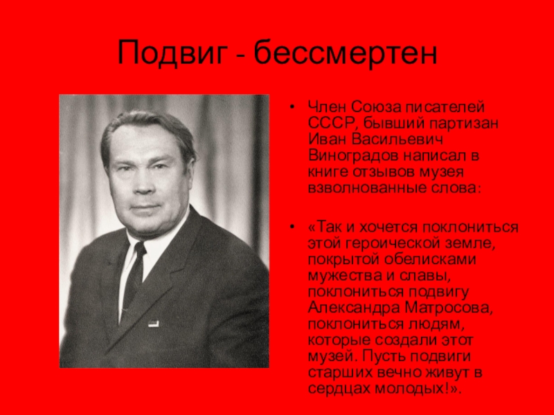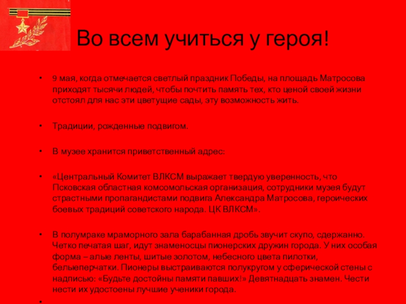 «Центральный Комитет ВЛКСМ выражает твердую уверенность, что Псковская областная комсомольская организация, сотрудники музея будут страстными пропагандистами подвига Александра Матросова, героических боевых традиций советского народа. ЦК ВЛКСМ».