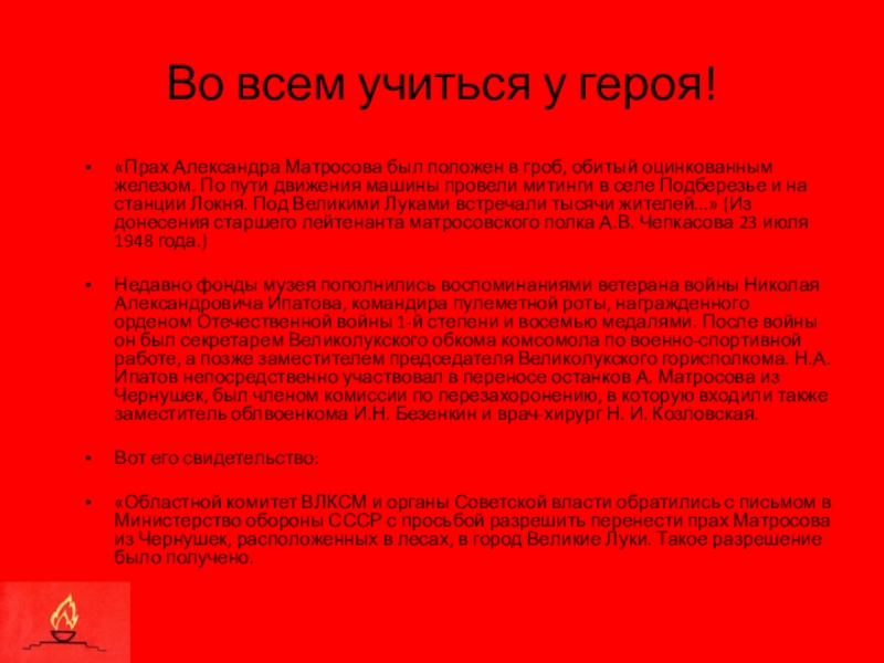 «Областной комитет ВЛКСМ и органы Советской власти обратились с письмом в Министерство обороны СССР с просьбой разрешить перенести прах Матросова из Чернушек, расположенных в лесах, в город Великие Луки. Такое разрешение было получено.