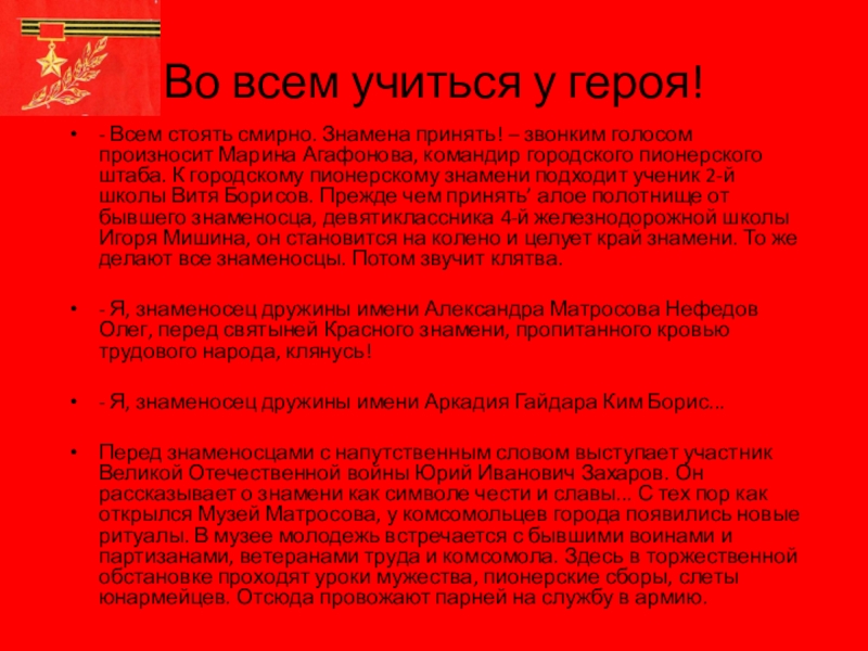- Я, знаменосец дружины имени Александра Матросова Нефедов Олег, перед святыней Красного знамени, пропитанного кровью трудового народа, клянусь!