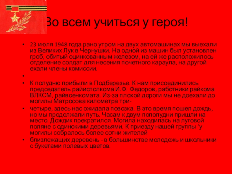обитый оцинкованным железом. По пути движения машины провели митинги в селе Подберезье и на станции Локня. Под Великими Луками встречали тысячи жителей...» (Из донесения старшего лейтенанта матросовского полка А.В. Чепкасова 23 июля 1948 года.)