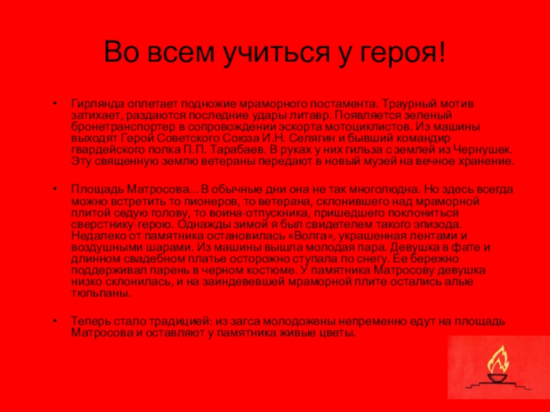 Площадь Матросова... В обычные дни она не так многолюдна. Но здесь всегда можно встретить то пионеров, то ветерана, склонившего над мраморной плитой седую голову, то воина-отпускника, пришедшего поклониться сверстнику-герою. Однажды зимой я был свидетелем такого эпизода. Недалеко от памятника остановилась «Волга», украшенная лентами и воздушными шарами. Из машины вышла молодая пара. Девушка в фате и длинном свадебном платье осторожно ступала по снегу. Ее бережно поддерживал парень в черном костюме. У памятника Матросову девушка низко склонилась, и на заиндевевшей мраморной плите остались алые тюльпаны.
