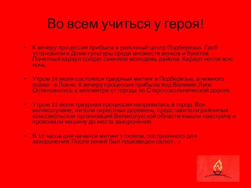 Утром 25 июля траурная процессия направилась в город. Все великолучане, жители окрестных деревень, представители районных комсомольских организаций Великолукской области вышли навстречу и провожали машину до места захоронения.