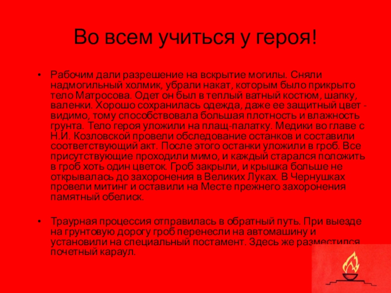 надмогильный холмик, убрали накат, которым было прикрыто тело Матросова. Одет он был в теплый ватный костюм, шапку, валенки. Хорошо сохранилась одежда, даже ее защитный цвет - видимо, тому способствовала большая плотность и влажность грунта. Тело героя уложили на плащ-палатку. Медики во главе с Н.И. Козловской провели обследование останков и составили соответствующий акт. После этого останки уложили в гроб. Все присутствующие проходили мимо, и каждый старался положить в гроб хоть один цветок. Гроб закрыли, и крышка больше не открывалась до захоронения в Великих Луках. В Чернушках провели митинг и оставили на Месте прежнего захоронения памятный обелиск.
