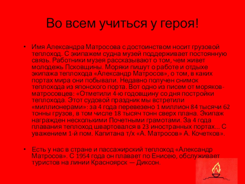 теплоход. С экипажем судна музей поддерживает постоянную связь. Работники музея рассказывают о том, чем живет молодежь Псковщины. Моряки пишут о работе и отдыхе экипажа теплохода «Александр Матросов», о том, в каких портах мира они побывали. Недавно получен снимок теплохода из японского порта. Вот одно из писем от моряков-матросовцев: «Отметили 4-ю годовщину со дня постройки теплохода. Этот судовой праздник мы встретили «миллионерами»: за 4 года перевезено 1 миллион 84 тысячи 62 тонны грузов, в том числе 18 тысяч тонн сверх плана. Экипаж награжден несколькими Почетными грамотами. За 4 года плавания теплоход швартовался в 23 иностранных портах... С уважением 1-й пом. Капитана т/х «А. Матросов» А. Кочетков».