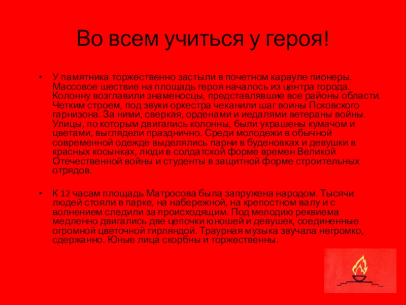 К 12 часам площадь Матросова была запружена народом. Тысячи людей стояли в парке, на набережной, на крепостном валу и с волнением следили за происходящим. Под мелодию реквиема медленно двигались две цепочки юношей и девушек, соединенные огромной цветочной гирляндой. Траурная музыка звучала негромко, сдержанно. Юные лица скорбны и торжественны.