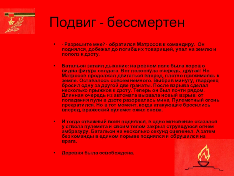 И тогда отважный воин поднялся, в одно мгновение оказался у ствола пулемета и своим телом закрыл струящуюся огнем амбразуру. Батальон на несколько секунд оцепенел. А затем без команды в едином порыве поднялся и обрушился на врага.