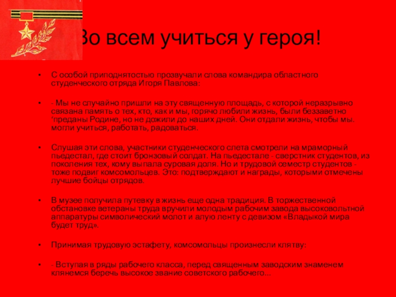 - Вступая в ряды рабочего класса, перед священным заводским знаменем клянемся беречь высокое звание советского рабочего...