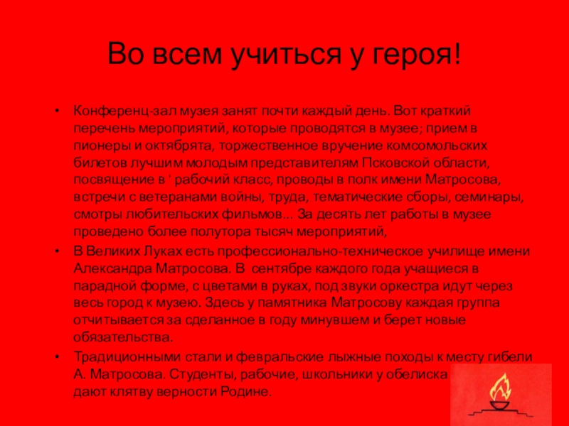 краткий перечень мероприятий, которые проводятся в музее; прием в пионеры и октябрята, торжественное вручение комсомольских билетов лучшим молодым представителям Псковской области, посвящение в ' рабочий класс, проводы в полк имени Матросова, встречи с ветеранами войны, труда, тематические сборы, семинары, смотры любительских фильмов... За десять лет работы в музее проведено более полутора тысяч мероприятий,