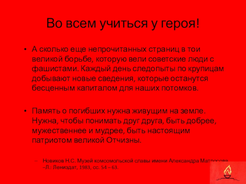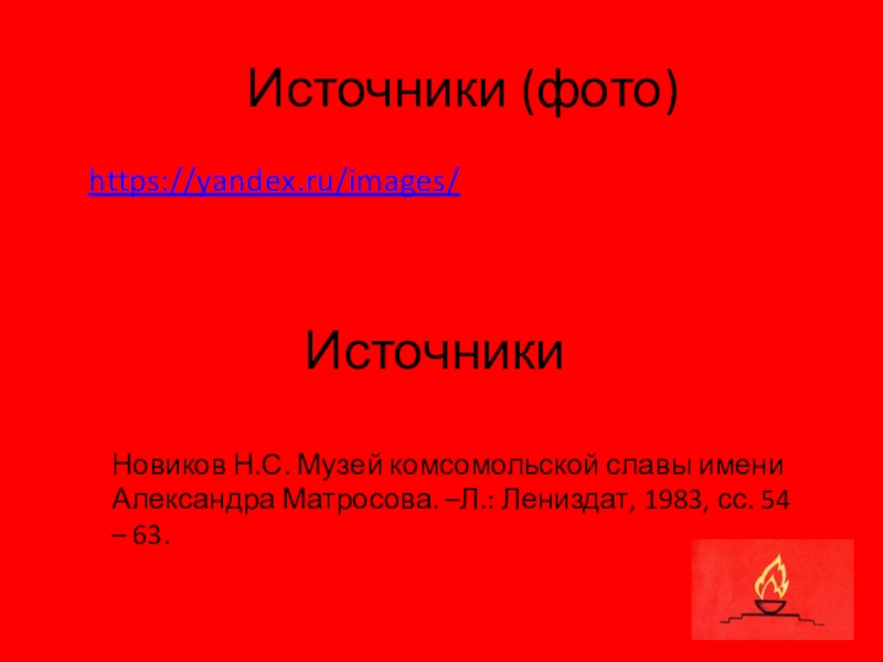 Новиков Н.С. Музей комсомольской славы имени Александра Матросова. –Л.: Лениздат, 1983, сс. 54 – 63.