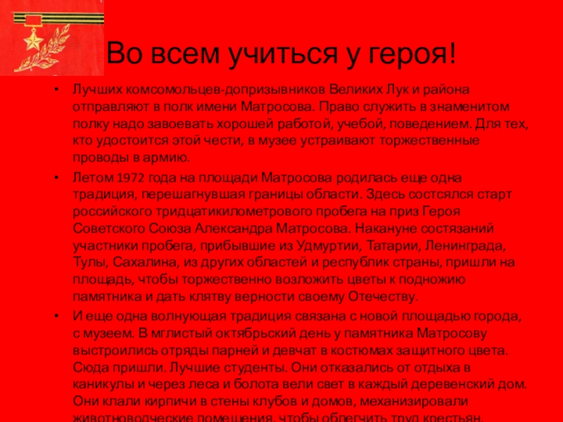 в полк имени Матросова. Право служить в знаменитом полку надо завоевать хорошей работой, учебой, поведением. Для тех, кто удостоится этой чести, в музее устраивают торжественные проводы в армию.