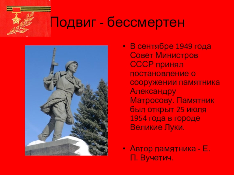 о сооружении памятника Александру Матросову. Памятник был открыт 25 июля 1954 года в городе Великие Луки.