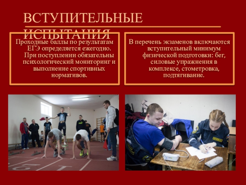 В перечень экзаменов включаются вступительный минимум физической подготовки: бег, силовые упражнения в комплексе, стометровка, подтягивание.