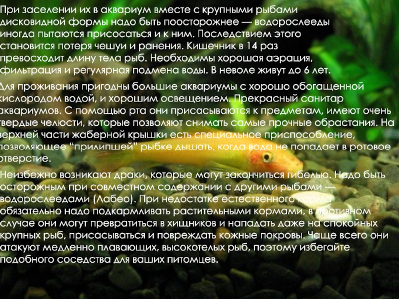 Для проживания пригодны большие аквариумы с хорошо обогащенной кислородом водой, и хорошим освещением. Прекрасный санитар аквариумов. С помощью рта они присасываются к предметам, имеют очень твердые челюсти, которые позволяют снимать самые прочные обрастания. На верхней части жаберной крышки есть специальное приспособление, позволяющее “прилипшей” рыбке дышать, когда вода не попадает в ротовое отверстие.