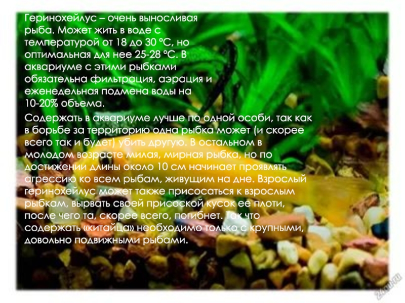 Содержать в аквариуме лучше по одной особи, так как в борьбе за территорию одна рыбка может (и скорее всего так и будет) убить другую. В остальном в молодом возрасте милая, мирная рыбка, но по достижении длины около 10 см начинает проявлять агрессию ко всем рыбам, живущим на дне. Взрослый геринохейлус может также присосаться к взрослым рыбкам, вырвать своей присоской кусок ее плоти, после чего та, скорее всего, погибнет. Так что содержать «китайца» необходимо только с крупными, довольно подвижными рыбами.