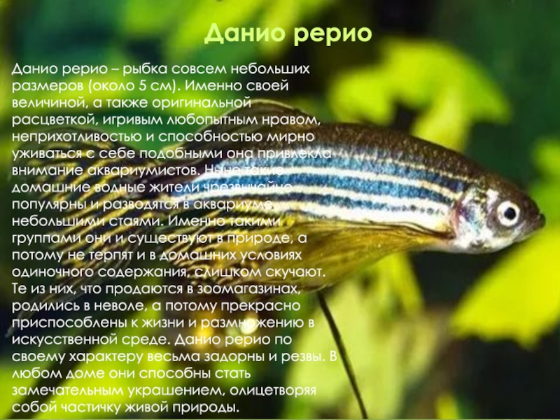 В англоязычных странах эта маленькая неприхотливая рыбка известна как zebrafish – рыбка-зебра. Такое название она получила за характерное чередование темных и светлых полос вдоль тела.