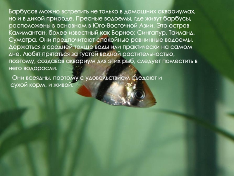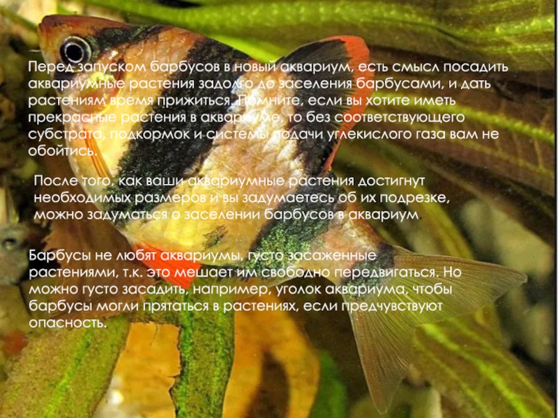 Барбусы не любят аквариумы, густо засаженные растениями, т.к. это мешает им свободно передвигаться. Но можно густо засадить, например, уголок аквариума, чтобы барбусы могли прятаться в растениях, если предчувствуют опасность.