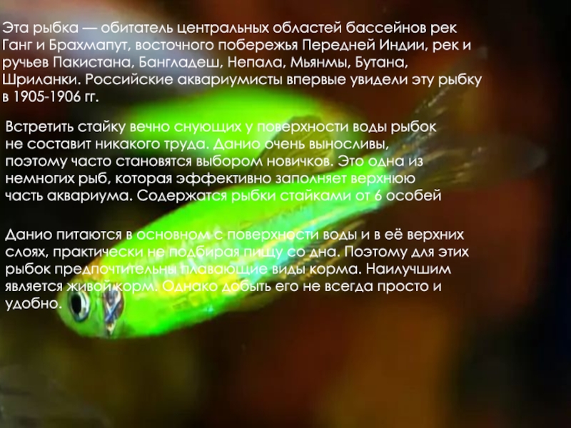 Встретить стайку вечно снующих у поверхности воды рыбок не составит никакого труда. Данио очень выносливы, поэтому часто становятся выбором новичков. Это одна из немногих рыб, которая эффективно заполняет верхнюю часть аквариума. Содержатся рыбки стайками от 6 особей
