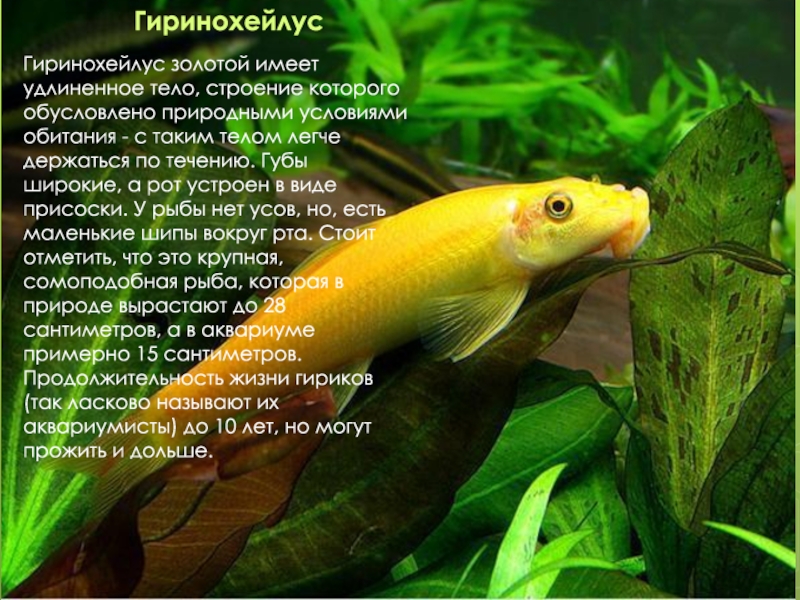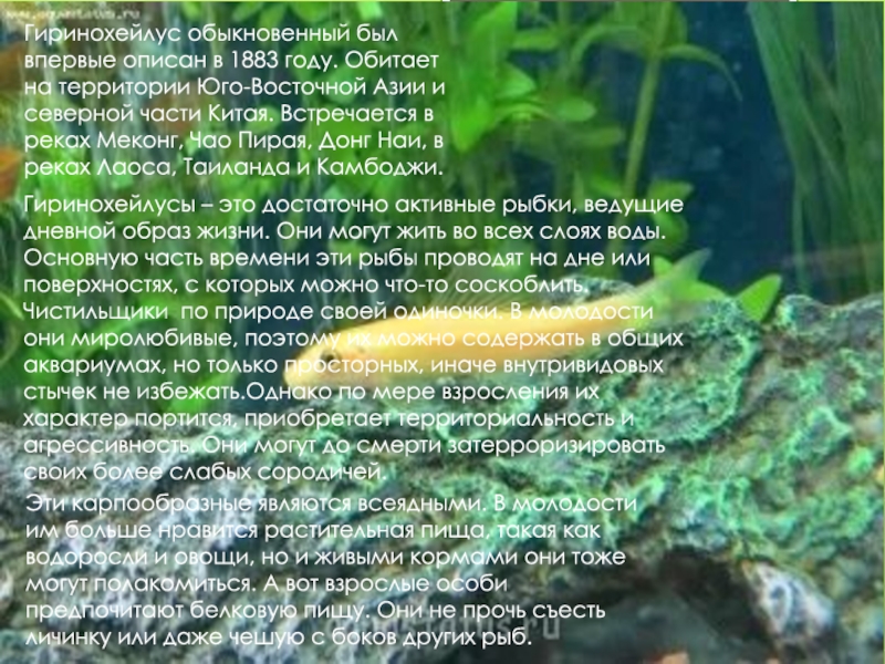Гиринохейлусы – это достаточно активные рыбки, ведущие дневной образ жизни. Они могут жить во всех слоях воды. Основную часть времени эти рыбы проводят на дне или поверхностях, с которых можно что-то соскоблить.Чистильщики по природе своей одиночки. В молодости они миролюбивые, поэтому их можно содержать в общих аквариумах, но только просторных, иначе внутривидовых стычек не избежать.Однако по мере взросления их характер портится, приобретает территориальность и агрессивность. Они могут до смерти затерроризировать своих более слабых сородичей.