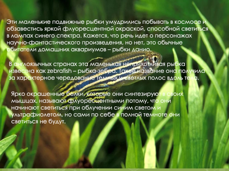 Ярко окрашенные белки, которые они синтезируют в своих мышцах, называют флуоресцентными потому, что они начинают светиться при облучении синим светом и ультрафиолетом, но сами по себе в полной темноте они светиться не будут.