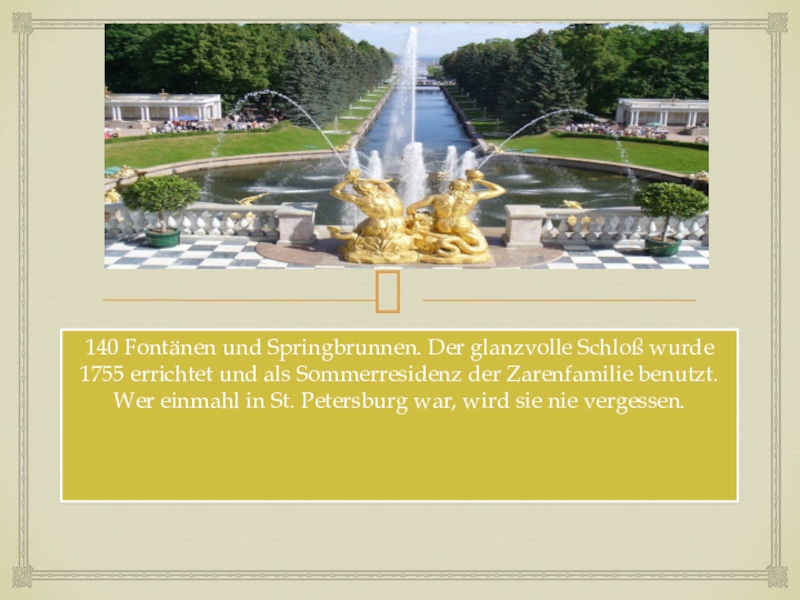 Слайд 12140 Fontänen und Springbrunnen. Der glanzvolle Schloß wurde 1755 errichtet und