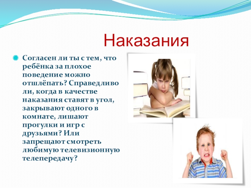Согласен ли ты с тем, что ребёнка за плохое поведение можно отшлёпать? Справедливо ли, когда в качестве наказания ставят в угол, закрывают одного в комнате, лишают прогулки и игр с друзьями? Или запрещают смотреть любимую телевизионную телепередачу?