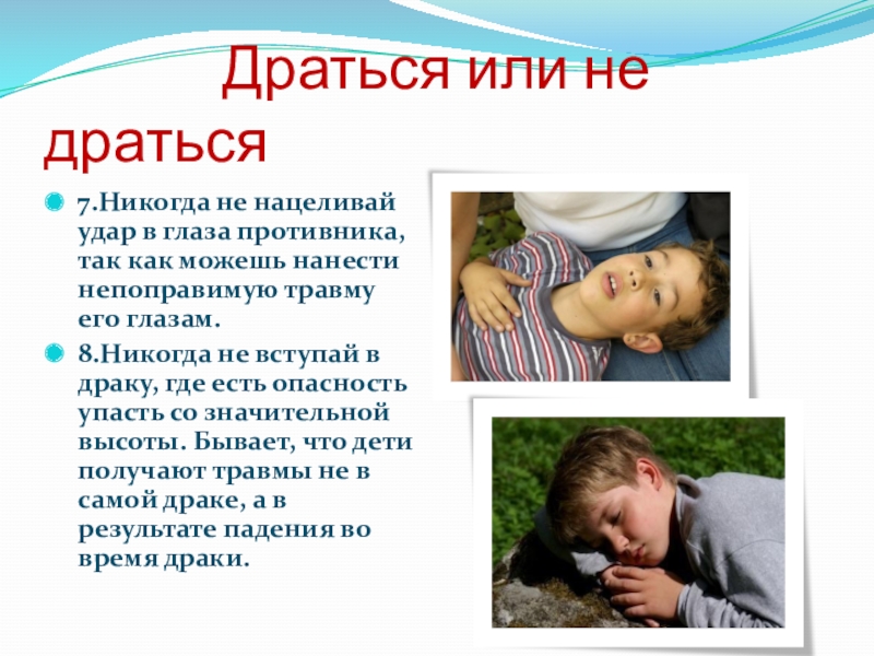 8.Никогда не вступай в драку, где есть опасность упасть со значительной высоты. Бывает, что дети получают травмы не в самой драке, а в результате падения во время драки.