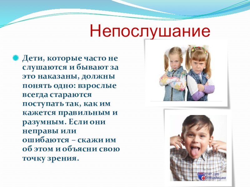 которые часто не слушаются и бывают за это наказаны, должны понять одно: взрослые всегда стараются поступать так, как им кажется правильным и разумным. Если они неправы или ошибаются – скажи им об этом и объясни свою точку зрения.
