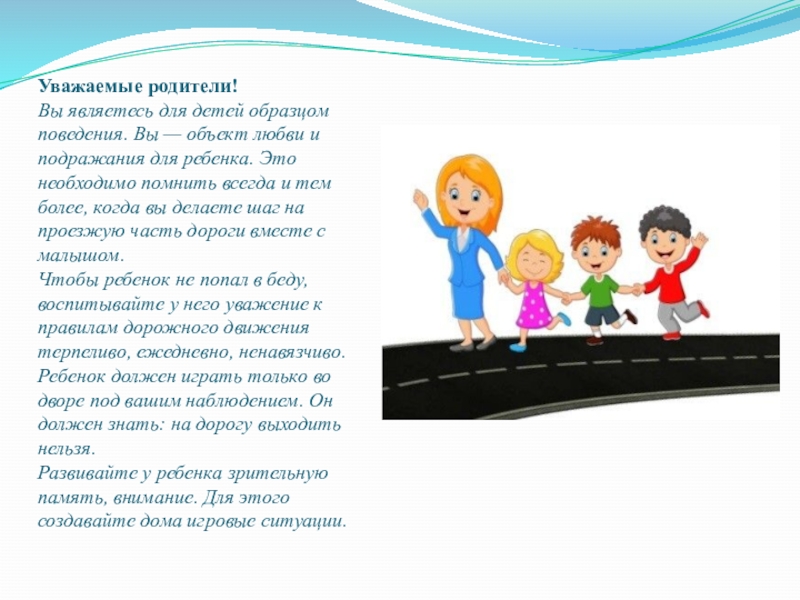 Слайд 9Важно чтобы родители были примером для детей в соблюдении правил дорожного