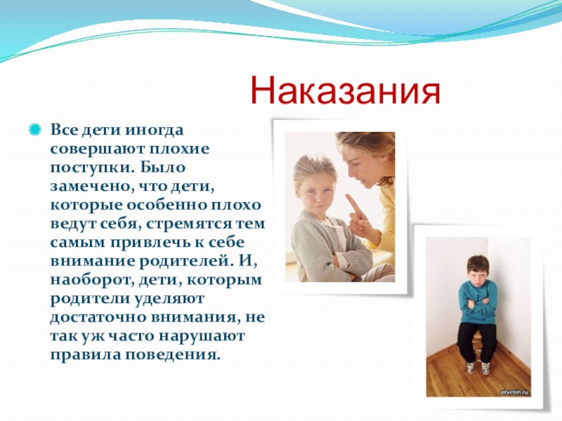 Все дети иногда совершают плохие поступки. Было замечено, что дети, которые особенно плохо ведут себя, стремятся тем самым привлечь к себе внимание родителей. И, наоборот, дети, которым родители уделяют достаточно внимания, не так уж часто нарушают правила поведения.