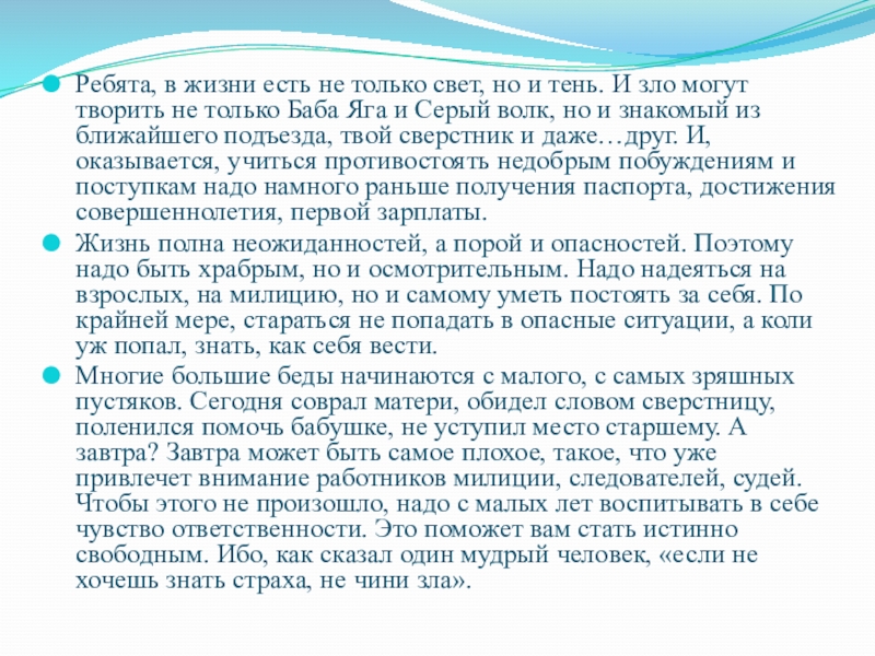 Многие большие беды начинаются с малого, с самых зряшных пустяков. Сегодня соврал матери, обидел словом сверстницу, поленился помочь бабушке, не уступил место старшему. А завтра? Завтра может быть самое плохое, такое, что уже привлечет внимание работников милиции, следователей, судей. Чтобы этого не произошло, надо с малых лет воспитывать в себе чувство ответственности. Это поможет вам стать истинно свободным. Ибо, как сказал один мудрый человек, «если не хочешь знать страха, не чини зла».
