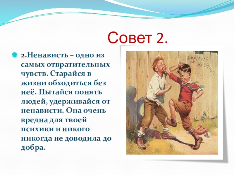 2.Ненависть – одно из самых отвратительных чувств. Старайся в жизни обходиться без неё. Пытайся понять людей, удерживайся от ненависти. Она очень вредна для твоей психики и никого никогда не доводила до добра.