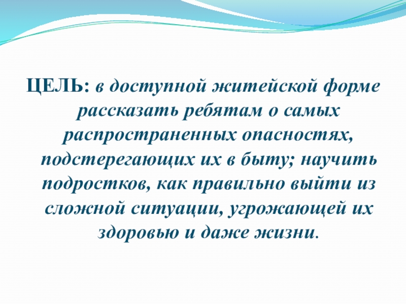 самых распространенных опасностях, подстерегающих их в быту; научить подростков, как правильно выйти из сложной ситуации, угрожающей их здоровью и даже жизни.