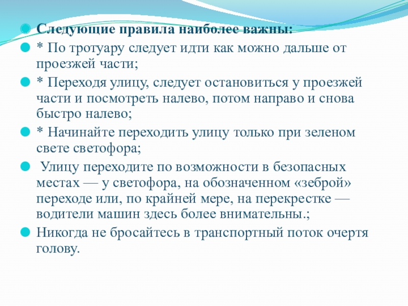 * Переходя улицу, следует остановиться у проезжей части и посмотреть налево, потом направо и снова быстро налево;