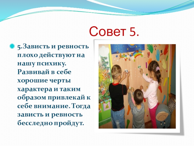 5.Зависть и ревность плохо действуют на нашу психику. Развивай в себе хорошие черты характера и таким образом привлекай к себе внимание. Тогда зависть и ревность бесследно пройдут.