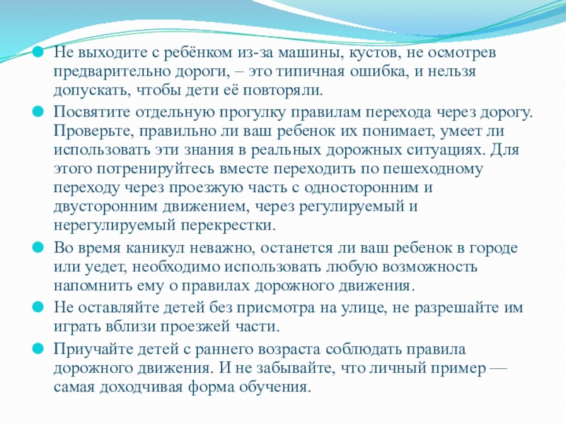 Слайд 10Не выходите с ребёнком из-за машины, кустов, не осмотрев предварительно дороги,