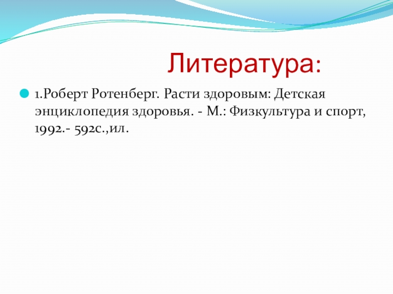 1.Роберт Ротенберг. Расти здоровым: Детская энциклопедия здоровья. - М.: Физкультура и спорт, 1992.- 592с.,ил.