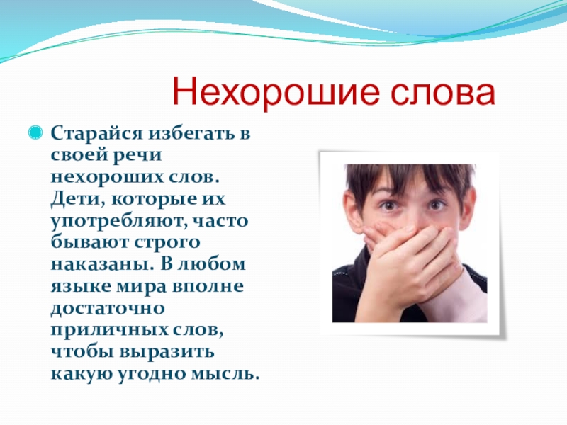в своей речи нехороших слов. Дети, которые их употребляют, часто бывают строго наказаны. В любом языке мира вполне достаточно приличных слов, чтобы выразить какую угодно мысль.