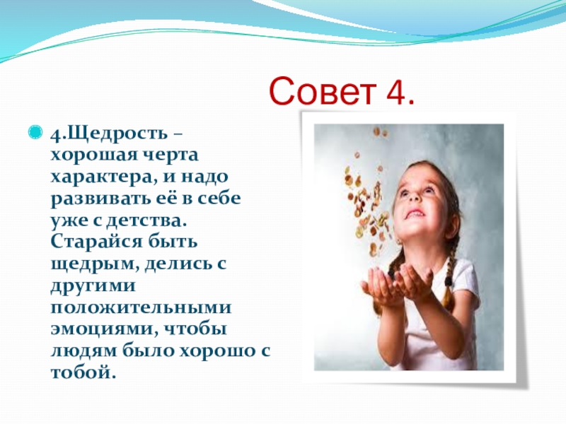 4.Щедрость – хорошая черта характера, и надо развивать её в себе уже с детства. Старайся быть щедрым, делись с другими положительными эмоциями, чтобы людям было хорошо с тобой.