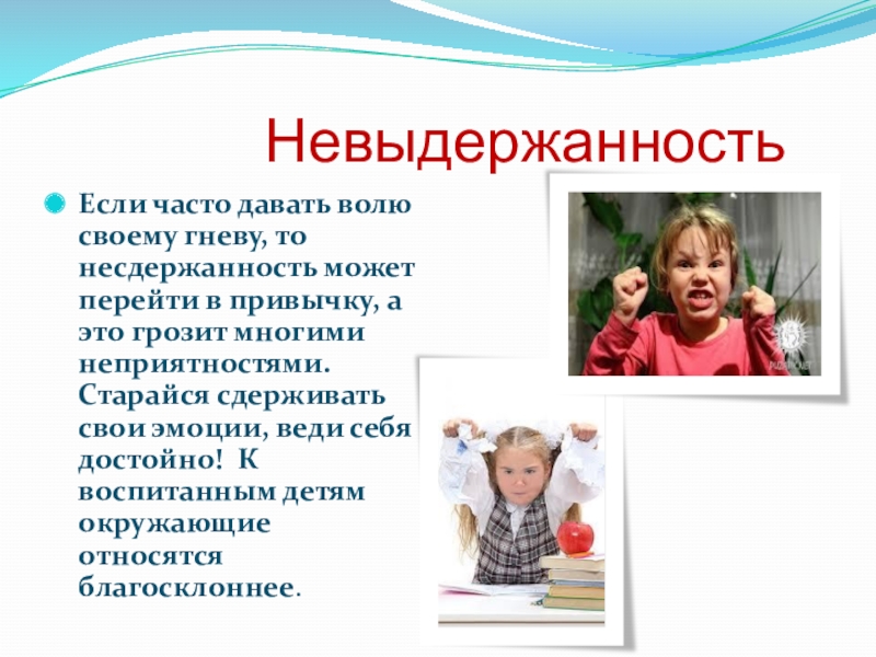 волю своему гневу, то несдержанность может перейти в привычку, а это грозит многими неприятностями. Старайся сдерживать свои эмоции, веди себя достойно! К воспитанным детям окружающие относятся благосклоннее.