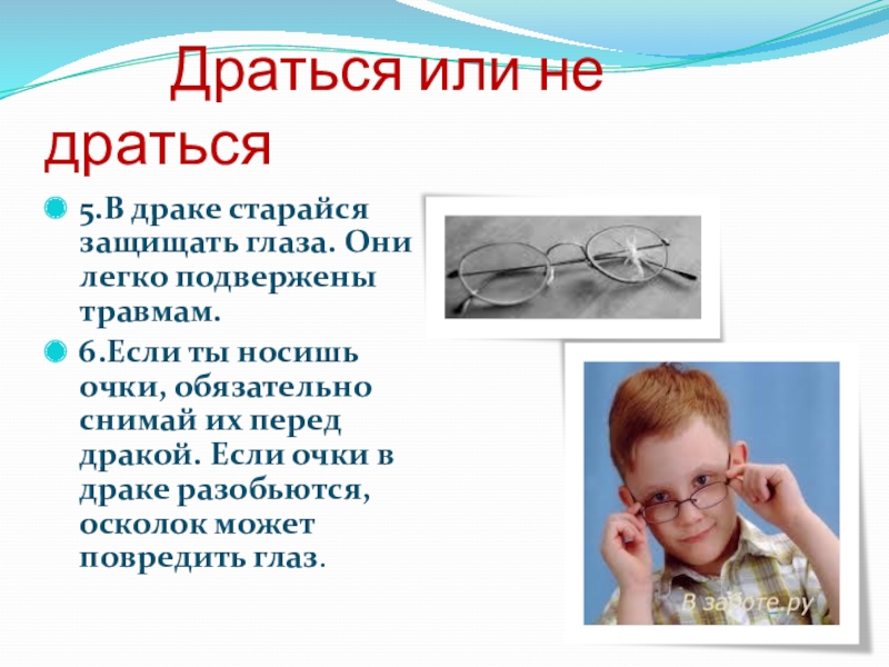 6.Если ты носишь очки, обязательно снимай их перед дракой. Если очки в драке разобьются, осколок может повредить глаз.