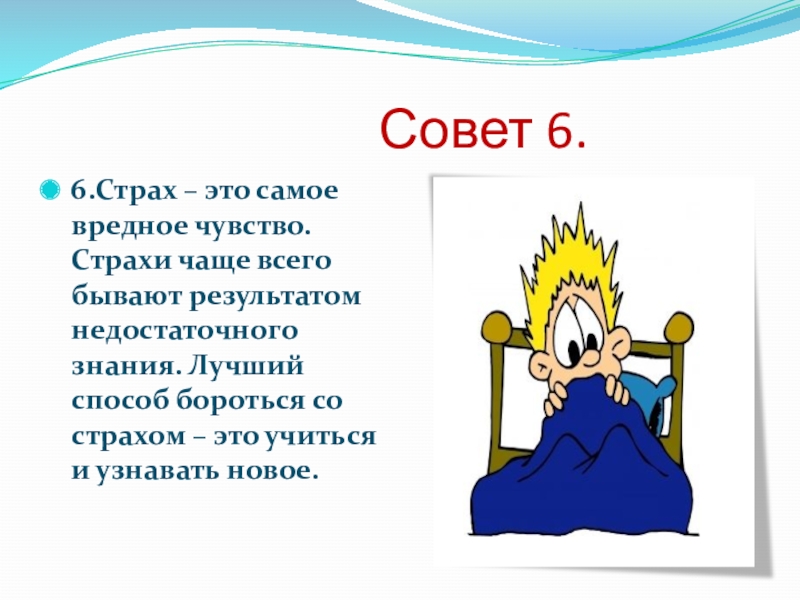6.Страх – это самое вредное чувство. Страхи чаще всего бывают результатом недостаточного знания. Лучший способ бороться со страхом – это учиться и узнавать новое.