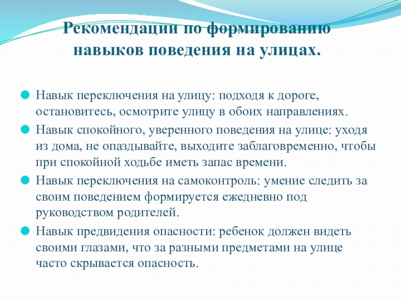 Слайд 8Рекомендации по формированию навыков поведения на улицах.