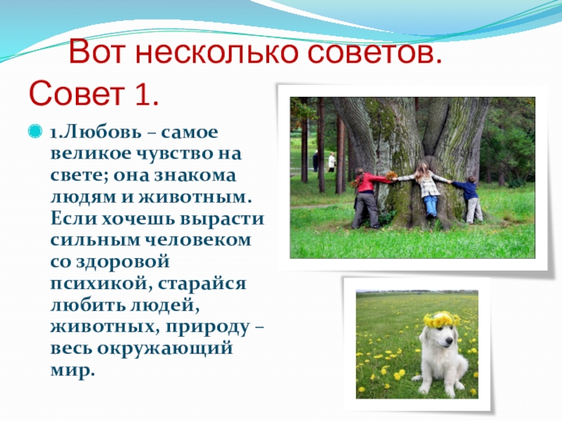 чувство на свете; она знакома людям и животным. Если хочешь вырасти сильным человеком со здоровой психикой, старайся любить людей, животных, природу – весь окружающий мир.